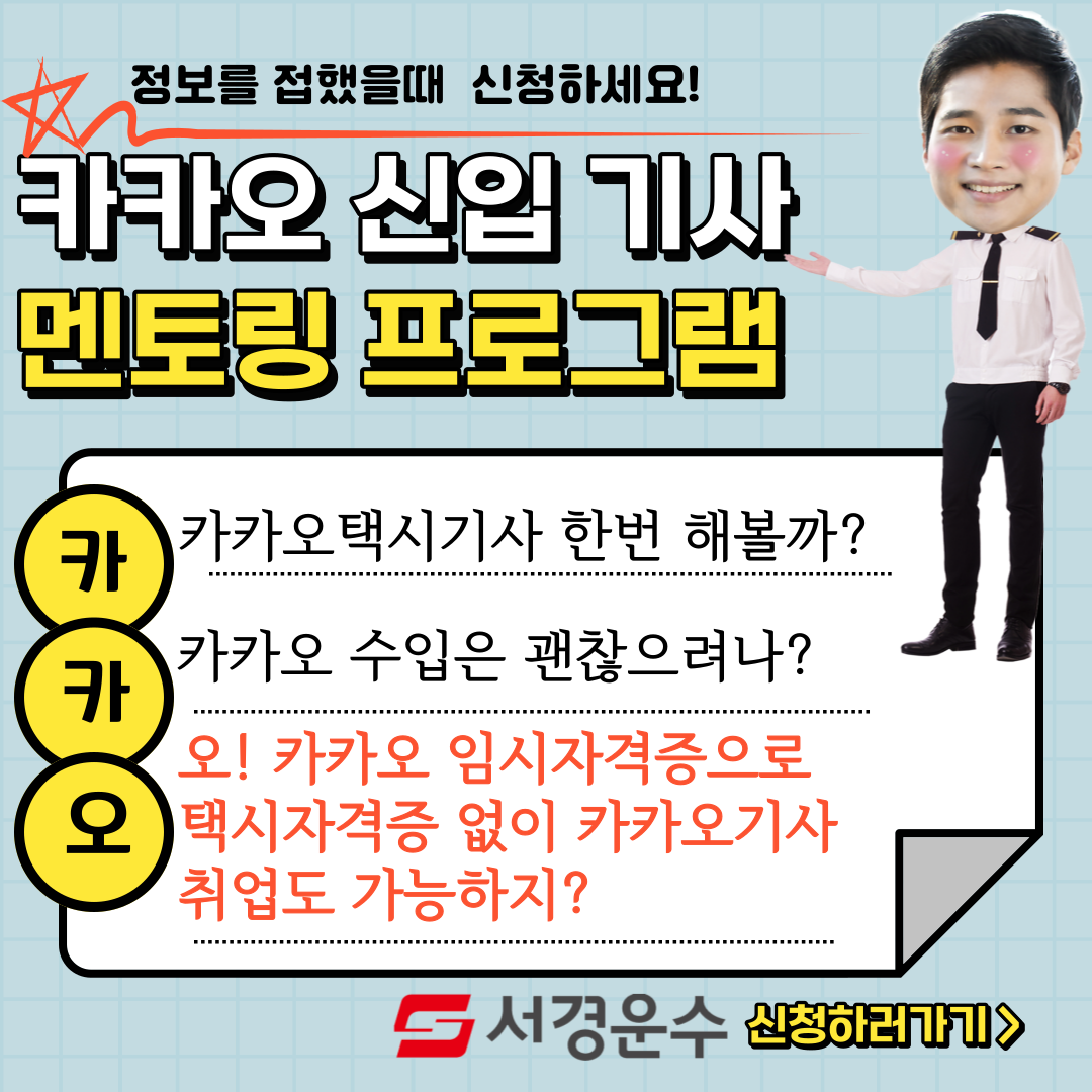 규제 샌드박스 통과로 택시면허증 없이 카카오 임시면허증으로 카카오택시 기사 취업이 가능해졌습니다. 카카오 임시면허증 발급은 서경 운수로 문의 바랍니다. 인천 ①서구 석남동 ②부평 청