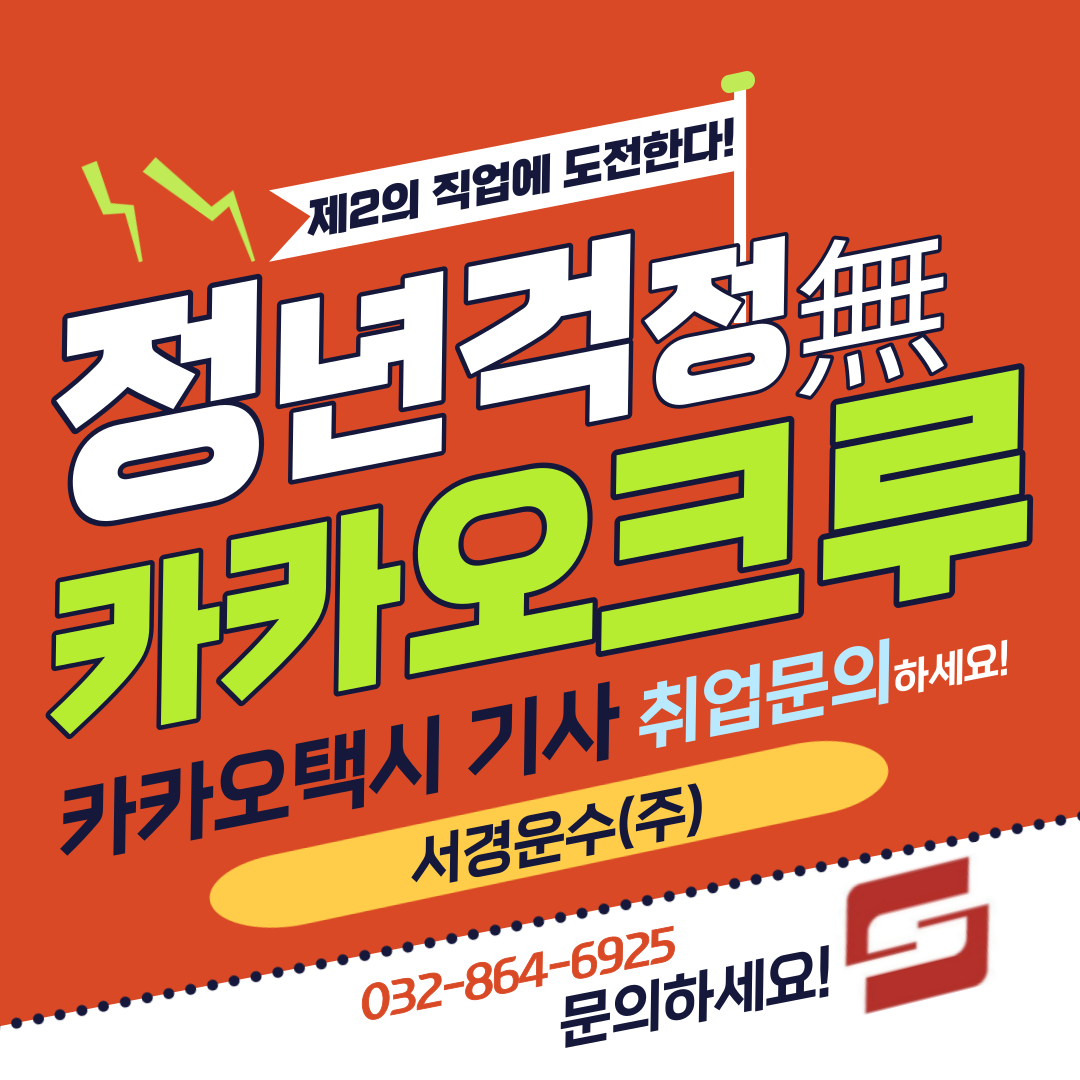 정년퇴임을 앞두고 계신가요?? 아니면 이미 명퇴나 코로나로 인해 자영업에 실패하셨나요? 이미 같은 아픔을 경험한 많은 분들이 카카오기사로 이직해서 자리를 잡고 일하고 있습니다. 카카오택시기사 근무조건이 궁금하시면 인천 카카오택시회사 서경운수에 연락주세요 2021년 5월 인천법인택시에서 일부 택시회사가 카카오택시 플랫폼 가맹을 맺으면서 인천택시업계는 일반택시회사와 카카오택시회사 이렇게 양분화되습니다. 2021년 2월 코로나19가 시작되면서 달이 갈수록 코로나의 위험성이 심화되면서 일반 택시회사 기사들의 수입금은 코로나의 영향으로 폭락했습니다. 하지만 그 시기에 카카오T블루 가맹을 맺고 카카오택시를 시작한 회사들은 코로나19속에서도 택시수입금에 영향을 받지 않고 꽤 안정적인 택시수입금 매출을 유지하고 있습니..